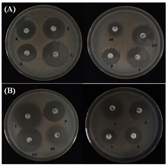 Figure 2. Antibiotic sensitivity test result of isolate (A) P. megaterium H1 and (B) B. subtilis I2. Note: Cif, ciprofloxacin; A, ampicillin; E, erythromycin; P, penicillin. C, cefotaxim; K, kanamycin; T, tetracycline; S, streptomycin.