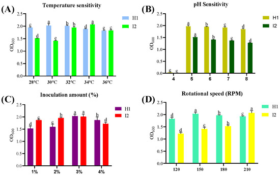 Figure 3. Effect of four different factors ((A) temperature, (B) pH, (C) inoculum size, (D) rotation speed) on the growth of antagonistic bacteria B. subtilis I2, P. megaterium H1 after 24 h of incubation. Error bars presented are the mean ± standard deviation of triplicates of three independent experiments. Different letters shows significant difference (p = 0.05).