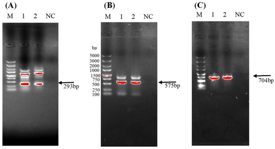 To detect the presence of gene targets associated with antimicrobial compounds in both B. subtilis and P. megaterium antagonist bacteria, PCR screening was conducted using specific primers outlined in (Table S1) [32,33]. The genes FenD, ItUc, YndJ, SrfAA, Spas, and QK1 were specifically targeted. The PCR program employed for this analysis featured an annealing temperature of 52 °C for fenD, ituC, and yndJ, while srfAA, Spas, and QK1 utilized temperatures of 62 °C, 58 °C, and 55 °C, respectively. Following the PCR reactions, the amplified products were separated on a 1.8% agarose gel in 0.5× Tris-borate EDTA (TBE) buffer for 2.5 h at 140 V. Visualization of the DNA bands was achieved by staining the gel with ethidium bromide. Size comparisons were conducted using a 5000 DNA marker provided by Nanjing Vazyme Biotech Company (Nanjing, China). Gel images were captured using an imaging system (Bio-Rad GelDoc EZ Gel Imaging System Thermo Fisher Scientific (Shanghai), Ltd., Shanghai, China).