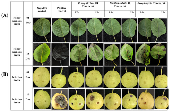 Potentially therapeutic and preventive activities of B. subtillis strain I2 and P. megaterium strain H1 against E. amylovora on detached pear tissues, such as leaves and fruits of the “Korla fragrant” pear, were investigated in the laboratory setting. To evaluate the effectiveness of the treatment, we used streptomycin. In order to evaluate the antibacterial properties of strains H1 and I2, we first used tap water to wash the removed leaves of the “Korla fragrant” pear. After being submerged in 3% bleach for 10 min, they were cleaned three times using sterile disinfected water (SDW). Using a syringe, we injected 100 μL of SDW into the intercellular gaps on the hollow petiole of mature leaves as a negative control. To maintain consistency, SDW was sprayed on all of the leaves [10,35].