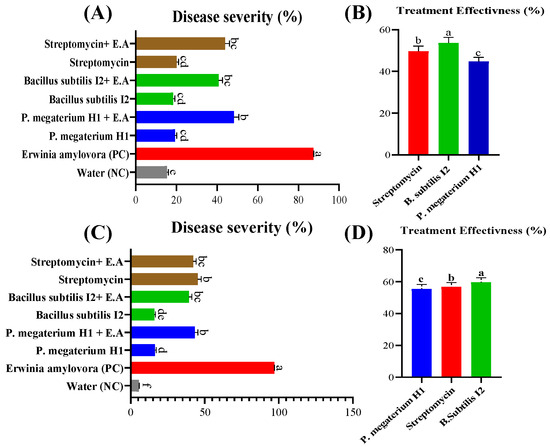 Figure 7. Disease severity and effectiveness of B. subtilis I2, P. megaterium H1, and the commonly used chemical compound (streptomycin) against E. amylovora. (A,B) fruits and (C,D) leaves. NC, negative control; PC, positive. Means with the same letter are not significantly different at p ≤ 0.05.