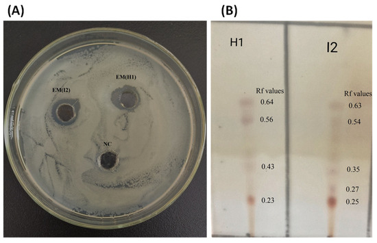 Figure 8. (A) The antibacterial activity analysis of organic extracts from P. megaterium strain H1 and B. subtilis strain I2 against E. amylovora on an NA medium. (B) Separation of active compounds by thin-layer chromatography (TLC). EM, extracted with methanol.