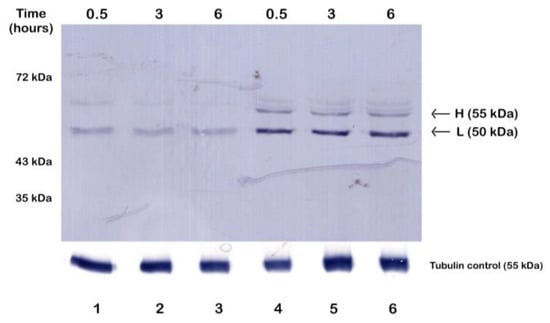 Since Fetal Calf Serum (FCS) contains different growth factors, attachment factors, vitamins, minerals, metabolites, and lipids, we compared the expression levels of TcPolβ in trypomastigotes incubated in RPMI1640 medium and RPMI1640 medium supplemented with 5% v/v of heat-inactivated FCS. In Figure 1, it can be observed that the levels of TcPolβ in cell-cultured trypomastigotes incubated in RPMI1640 medium supplemented with 5% v/v of heat-inactivated FCS are higher than those of parasites incubated in RPMI1640 without FCS (compare lanes 1–3 with lanes 4–8). Figure 1 shows that both forms, H and L, are augmented in trypomastigotes incubated with heat-inactivated FCS compared to those incubated in media alone. The results presented in Figure 1 are not due to differences in the number of cells since both cultures contain the same number of trypomastigotes (250.000 cells). Moreover, the levels of a constitutive protein, such as tubulin, do not change in the cells incubated in media alone or media supplemented with heat-inactivated FCS (Figure 1, lower panel). These results indicate that FCS components signal TcPolβ protein synthesis and phosphorylation in trypomastigotes since the antibody is able to recognize both forms of TcPolβ (H and L), and both forms are augmented.
