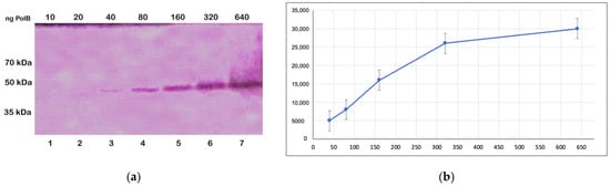 DNA polymerase gel activity assay followed by colorimetric detection. (a) Different amounts of recombinant TcPolβ (10–640 ng) were separated on a 10% PAGE-SDS, renatured, and incubated with a solution containing dNTPs, including dATP-16-Biotin labeled and detected using Streptavidin-Alkaline phosphatase as described in the Section 2. The assay’s detection limit is 40 ng, and a linear dose–response was obtained with this technique. (b) A plot was obtained from the quantification of Figure 2a.