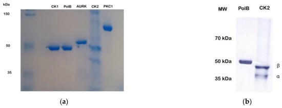 Encoding genes for TcCK1, TcCK2, TcAUK1, TcPKC1, and TcPolβ were inserted in pET15b (Novagen, Merck KGaA, Darmstadt, Germany) and transformed in BL21 (DE3) cells, and their protein expression was induced by 0.5 mM IPTG addition [,]. Recombinant TcCK1, TcCK2 (α–β subunits), TcAUK1, TcPKC1, and TcPolβ proteins were purified according to references [,] using NTA-Ni-agarose resin. Protein concentration was determined by the Bio-Rad protein assay Kit (Hercules, CA, USA) using BSA as standard. The purity of the recombinant polypeptides was assayed by PAGE-SDS, followed by colloidal Coomassie Blue G-250 staining (Invitrogen, ThermoFisher Scientific, Waltham, MA, USA). Colloidal Coomassie Blue G-250 can detect less than 10 ng of protein on a PAGE-SDS following the manufacturer’s instructions.