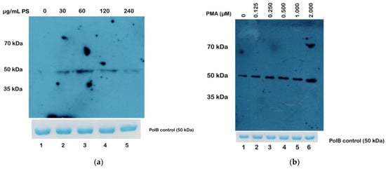 Since TcPolβ phosphorylation can be detected by Western blot with anti-phosphor antibodies, we next investigated, using this method, whether PMA and phosphatidylserine (PS) could stimulate TcPolβ phosphorylation by TcPKC1. Figure 5 shows the results of these experiments. We limited the substrate (TcPolβ) to perform these experiments to see an optimal stimulation signal. It can be observed that PS stimulates TcPolβ phosphorylation at 60 µg/mL as the optimal concentration (Figure 5a, lane 3). Higher concentrations of PS (120 and 240 µg/mL, lanes 4 and 5, respectively) do not further stimulate TcPolβ phosphorylation. Also, PMA stimulates the phosphorylation activity of TcPKC1 (Figure 5b, lanes 2–6). Maximal stimulation of PKC1 by PMA is around 1–2 µM. These results indicate that PKC1 can be activated by PS and PMA, probably owing to the PhoX domain present at the N-terminus of this protein kinase or to another additional domain present in the polypeptide.
