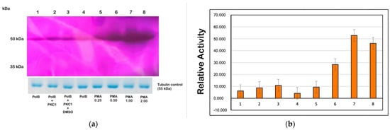 PMA stimulates PKC1 to augment the DNA synthesis activity of TcPolβ. The PMA effect was measured by a DNA polymerase gel activity assay followed by colorimetric detection. (a) Forty nanograms (40 ng) of TcPolβ were used in the experiment in all lanes from 1 to 8 and incubated under several conditions. Lane 1 contains only TcPolβ, while lane 2 contains 40 pmol of PKC1 plus 1 mM ATP. Lane 3 contains the same components as lane 2 plus DMSO. Lane 4 contains TcPolβ and 1 mM ATP. Lanes 5–8 contain TcPolβ, 40 pmol of PKC1, 1 mM ATP, and increasing amounts of PMA from 0.25–2.00 µM as indicated at the bottom of the figure. (b) Quantification of (a). A Polβ loading control from a Coomassie Blue G-250 stained PAGE-SDS was included, as seen at the bottom of Figure 3a.