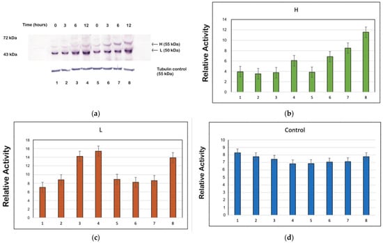 Since PMA could in vitro activate TcPKC1 at a concentration of 2 µM (see Figure 6a), we investigated whether TcPolβ phosphorylation could be increased in vivo in T. cruzi epimastigotes and trypomastigotes cells. We treated epimastigotes and trypomastigotes with 2 µM of PMA to perform these experiments. We measured the levels of TcPolβ H and L forms at 0, 3, 6, and 12 h after treatment by Western blot using anti-TcPolβ antibodies. After 12 h of PMA treatment, the parasites remained viable and mobile. In epimastigotes, the phosphorylated H form of TcPolβ was found to be augmented compared with the control (DMSO treated), as seen in Figure 7a. At 3 h post-treatment with PMA, there is an increase in the H form, and it was maintained until 12 h after the treatment (Figure 7a, lanes 6–8) compared with the control (lanes 2–4). The tubulin control (lower panel, lanes 1–8) does not vary significantly. Trypomastigotes did not respond to the treatment with PMA under the same tested conditions (2 µM) as the epimastigotes did. These results indicate that PMA can in vivo stimulate TcPKC enzymes to increase the phosphorylation levels of TcPolβ in epimastigotes. Quantification of the signals on the Western blot by using the Image J program confirms that there is an increase in the H form in epimastigotes treated with PMA (Figure 7b, lanes 5–8) compared with DMSO-treated epimastigotes (Figure 7b, lanes 2–4). The increase is about 2–3-fold from 3 h post-treatment. The L form of TcPolβ tends to augment equally in both groups of parasites (Figure 7c, lanes 1–8). The tubulin control does not change significantly, whether in DMSO- or PMA-treated epimastigotes (Figure 7d).