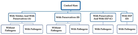 For the design and development of the study, we contacted a meat industry that produced cooked ham. The disc diffusion method was used to evaluate the antibacterial activity of EEP. Petri dishes were prepared with Mueller Hinton Agar (MHA Biokar Diagnostics, Zac de Ther, Beauvais, France), and inoculated with bacterial culture in MHB before overnight incubation at 37 °C (2 × 108 cfu/mL). Afterward, eight peripheral sterile Whatman filter paper discs with a symmetrical arrangement template and a central one were placed in each plate. Twenty µL of the EEPs were placed in the peripheral discs, using the same volume of 70% ethanol as a negative control. The growth of the inoculated strain was evaluated after incubation for 48 h at 37 °C (L. monocytogenes and S. aureus) and 30 °C (B. cereus and C. sporogenes), measuring the diameter of inhibition generated around the discs while using the diameter of inhibition of the central disc of each plate as a control. The diameter zones, including the diameter of the disc, were recorded. The minimum inhibitory concentrations (MICs) and minimum bacteriostatic concentrations (MBCs) were determined for the microorganisms selected against EEP based on previous studies [,]. From the EEP and based on the results of the composition analysis and determination of active compounds, further dilutions ensured a range concentration of 2500 µg of raw propolis/mL in the most concentrated dilution. V-bottom microtiter plates contained 50 µL of MHB in each cell. The MIC values determination, namely the minimum concentration that allows visible microbial growth, was achieved through known serial dilutions, using the last row of each plate as a growth control without EEP. The propolis’ concentrations inoculated ranged from 2500 µg/mL to 39.0625 µg/mL in the most diluted one. Finally, 50 of the bacterial inocula in MHB were included in each column and incubated at 37 °C for 48 h for L. monocytogenes and S. aureus (all covered with breathable rayon film), 30 °C for B. cereus, while C. sporogenes microtiter plates were incubated for 48 h under anaerobic conditions. In addition, complementary and parallel staining with Resazurin (Sigma Aldrich, St. Louis, MO, USA) at 0.01% showed a redox reaction, indicating the presence of viable cells in the dilution by a color change (naturally blue but turns purple). Results were obtained after 4 h of incubation. The concentration chosen to be incorporated in the meat product was established according to two essential parameters. The first issue was the antimicrobial property of the EEP against the different microorganisms (MIC and MBC), and the second issue was the cooked ham’s sensory characteristics, which wanted to be preserved []. The EEP was incorporated as an alternative to the nitrites that the industry contemplates in its commercial formulation. Thus, four formulations were considered: traditional recipe (A) with nitrites and with preservatives; (B) without nitrites and with preservatives; (C) without nitrites, with preservatives, with EPP; and (D) without nitrites, without preservatives, with EEP. Once elaborated, according to the industry’s recipe, each product was portioned under sterile conditions. A control group was established for each of them. On the other hand, the previously designed pool of pathogenic microorganisms was inoculated by applying it to the cooked ham. Three batches of each product and three samples of each batch per sampling point were prepared (according to the EFSA indications challenge test) []. The days of analysis were established considering the shelf life of the cooked ham indicated by the company (45 days). Thus, the following days were established: 0, 7, 15, 30, and 45. The storage temperature was 4 °C until day 30 and 8 °C until day 45 (Figure 1).