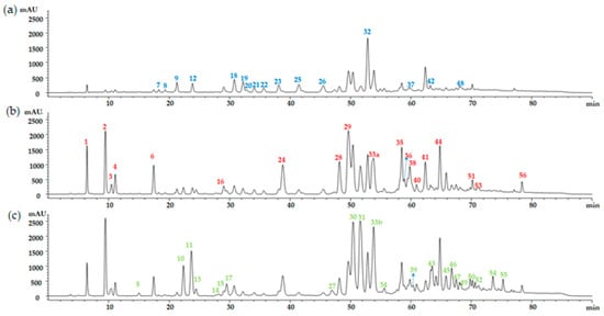 Chromatograph of ethanolic propolis extract monitoring for phenolic compounds: (a) 360 nm, (b) 330 nm, and (c) 280 nm.