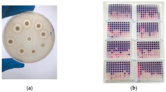 Representation of EEP inhibition capacity chosen against bacteria targets of assay. (a) Disc diffusion agar assay results L. monocytogenes; (b) microtiter plates and MIC and MBC tests (B. cereus, C. sporogenes, L. monocytogenes, and S. aureus).