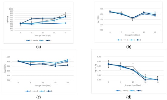 The spore-forming bacteria B. cereus did not exhibit an increase in the final shelf lifetime, except for batch C, which increased by 0.20 log10 CFU/g. The study of C. sporogenes revealed a drastic reduction in the counts in the four recipes, with values up to 3.00 log10 CFU/g. Both results refer to vegetative cells and spores since the storage conditions required temperatures below 8 °C to prevent germination. All results are shown in Figure 4.