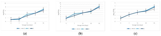 Evolution of indigenous microorganisms along storage time: (a) mesophilic aerobic microorganisms; (b) psychrotrophic microorganisms; (c). lactic acid bacteria.