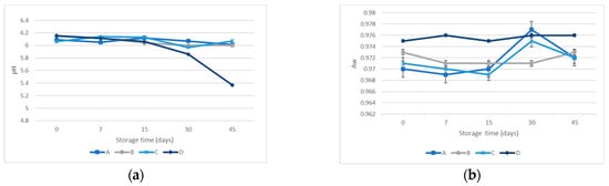 The pH and water activity (Aw) were measured in all samples and batches throughout the storage, from the initial day to the last day of shelf life, which was established as an analysis point. pH values (pH Electrode, pH50 + DHS, XS Instruments, Carpi, Italy) were measured according to the Association of Analytical Communities (AOAC) guide and the Aw analyses (Water Activity meter LabMaster Aw, Novarasina, Neuheimstrasse, Lachen, CH, Switzerland) [].