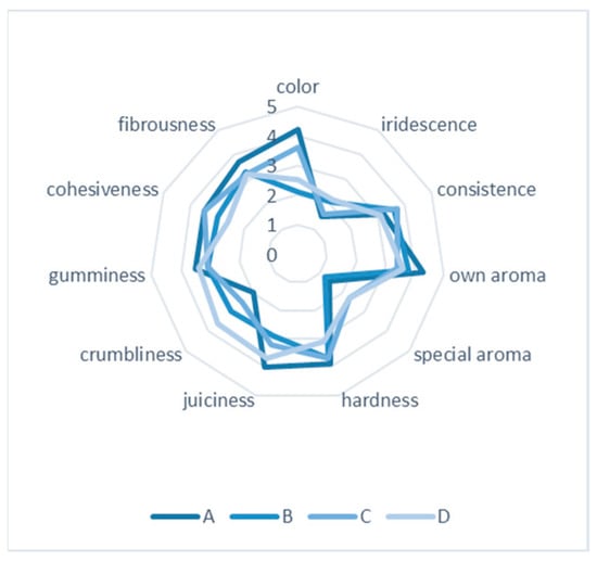 Sensory evaluation result of cooked ham samples. (A) Batch with nitrites and preservatives, (B) batch without nitrites and with preservatives, (C) batch with preservatives and with EEP, and (D) batch with EEP.