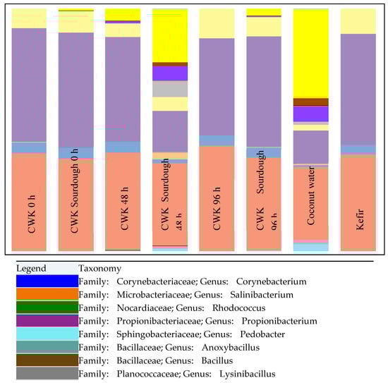 Stacked bar graph representing the bacterial compositions of CWK-fermented sourdough (at times, T = 0, 48 and 96 h), fermented CWK (at times, T = 0, 48 and 96 h), coconut water and kefir determined via the MiSeq Illumina sequencing method.