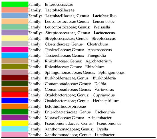 All the LAB and acetic acid bacterial isolates identified previously were grown in triplicates in MRS broth at 30 °C for 48 h. The broths were centrifuged at 5000 rpm for 10 min (Heraeus Labofuge 200; Thermo Scientific). For genomic DNA isolation, cell pellets were re-suspended in double-distilled water and microwaved for 30 s at 150 °C (Living and Co., Auckland, New Zealand). This was followed by centrifugation at 1000 rpm for 5 min at room temperature (Heraeus Labofuge 200; Thermo Scientific). The supernatant (about 5 µL) was used in a polymerase chain reaction (PCR) with 5 pmol each of the forward and reverse primers, PCR1 forward (5′ TCGTCGGCAGCGTCAGATGTGTATAAGAGACAGCCTACGGGNGGCWGCAG 3′) and PCR1 reverse (5′ GTCTCGTGGGCTCGGAGATGTGTATAAGAGACAGGA CTACHVGGGTATCTAATCC 3′), with KAPA HiFi Hotstart Readymix (Kapa Biosystems, Wilmington, MA, USA). The following thermocycling parameters were used: 95 °C for 3 min, 25 cycles of 95 °C for 30 s, 55 °C for 30 s, 72 °C for 30 s, 72 °C for 5 min, and a holding temperature of 15 °C. PCRs were carried out using an Eppendorf vapoproject AG 223331 PCR machine (Hamburg, Germany).