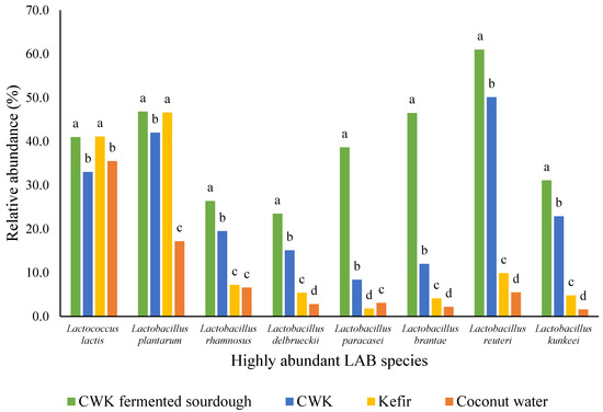 The relative abundances of 8 LAB species for CWK fermented sourdough, CWK, CW and kefir. These 8 LAB species are the highly dominating species across all the samples. Letters a–d represent significant changes for each isolate for CKW-fermented sourdough, CWK, kefir and coconut water.