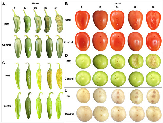 Evaluation of the infective capacity of SM2 isolate. Fruits and tubers were inoculated with bacterial suspension at a concentration of 108 CFU/mL. (A) Jalapeño pepper (Capsicum annum); (B) tomato (Solanum lycopersicum); (C) serrano chili (Capsicum annuum); (D) green tomato (Physalis ixocarpa); (E) potato (Solanum tuberosum). Over 48 h, the soft rot symptoms were registered.