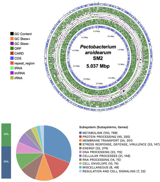 Circular genomic map and subsystems information for P. aroidearum SM2. From the outside to the center are the ensemble contigs, with CDSs in the front strand, ORF on the reverse strand, RNA genes, CDSs with similarity to known antibiotic resistance genes, CDSs with similarity to virulence factors, GC content, and GC skew. The distributions of the subsystems are displayed in the figure below. In terms of subsystems coverage, 45% indicates a total of 2269 genes and 55% represents those not indicated in the subsystem average, with a total of 2829 genes.