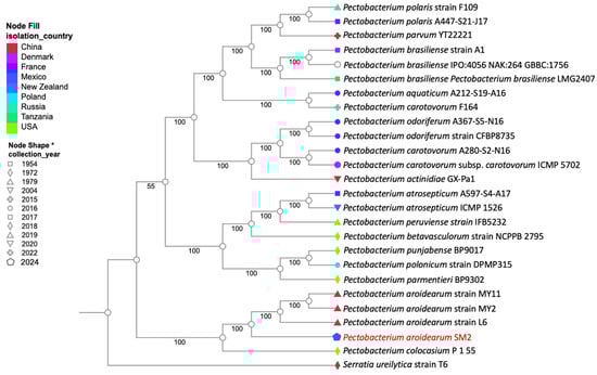 Phylogenomic analysis of P. aroidearum SM2. Phylogenetic analysis for species of Pectobacterium genus was performed in BV-BRC. The node shape represents the collection year. The node color represents the country from which the isolates were collected, including Mexico, China, Denmark, France, Poland, Russia, Tanzania, the USA, and New Zealand. Serratia ureilytica strain T6 was included as an outgroup.