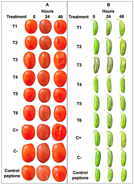 Bacterial competitive colonization interaction assays were performed on healthy fruits of tomato (Solanum lycopersicum) and jalapeño chili (Capsicum annum) to assess the potential of the strain K. cowanii Cp1 (previously isolated and characterized [26]) against the P. aroidearum SM2 strain and its ability to reduce soft rot symptoms. The fruits were inoculated as previously described above in the infection methodology, with 10 µL of each bacterial suspension added at a concentration of 1 × 108 CFU/mL, according to the treatments shown in Table 1. The interactions of K. cowanii Cp1 and P. aroidearum SM2, inoculated at the same time (T1), were evaluated. Similarly, P. aroidearum SM2 was inoculated first (time 0), followed by K. cowanii Cp1 at 3 and 6 h (T2 and T3), to evaluate pathogen establishment; in turn, K. cowanii Cp1 was inoculated first (time 0), followed by P. aroidearum SM2 at 3, 6, and 9 h (T4, T5, and T6). The controls were inoculated only with K. cowanii Cp1 (T7), P. aroidearum SM2 (T8), and 0.1% peptone (T9). The inoculated fruits were placed inside an airtight container at room temperature (25 °C) and natural sunlight conditions. The treatments were observed for 48 h to determine the soft rot symptoms.