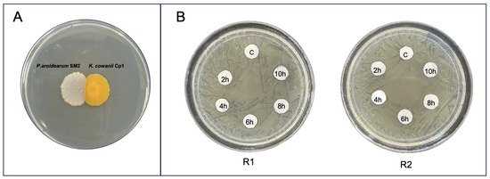Evaluation of bacterial growth inhibition essays. (A) K. cowanii Cp1 and P. aroidearum SM2 in confrontation and (B) cell-free filtrate tests performed at 2, 4, 6, 8, and 10 h of growth of K. cowanii Cp1, evaluated directly on P. aroidearum SM2 in duplicate (R1 and R2).