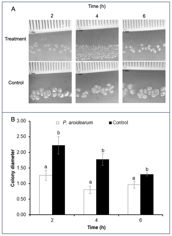 Inhibition of bacterial growth colonies of P. aroidearum SM2 through VOCs produced by K. cowanii Cp1. (A) Bacterial growth colonies produced using the double culture method and (B) measurement of colony diameter at 2, 4, and 6 h of experimental growth. The data were analyzed using Tukey’s mean adjustment test (p = 0.05), which was performed in the Minitab Statistical Software. Values by different letters show statistical differences.