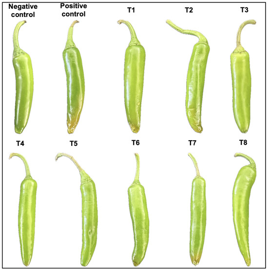 The infected fruits of Capsicum annuum var. Serrano with soft rot symptoms were obtained from a local market at Querétaro, México. The damaged tissue was scraped with an inoculation loop under sterile conditions and spread on the surface of tryptic soy agar (TSA) medium (Difco Laboratories; Detroit, MI, USA) and incubated for 24 h at 37 °C. The bacterial colonies obtained were tested according to Koch’s postulates on healthy serrano chili fruits obtained from a local market in Querétaro, México. The healthy chili fruits were surface-sterilized via immersion in 10% (v/v) sodium hypochlorite for 10 min, then in 75% (v/v) ethanol for 10 min, and finally dried under sterile conditions. Each bacterial isolate was prepared in 0.1% peptone at a dilution of 1 × 108 UFC/mL [29] and vortexed for 1 min, then 10 µL of each bacterial suspension was inoculated in triplicate on the chili fruits’ surfaces, which were punctured with a sterile needle and inoculated at that point. Negative controls were inoculated with 0.1% peptone. The inoculated chili fruits were placed inside an airtight container at room temperature (25 °C) and natural sunlight conditions. The experiment was performed in duplicate, and bacterial colonies that did not present infection symptoms during the 3 days that they were observed in chili fruits were discarded.