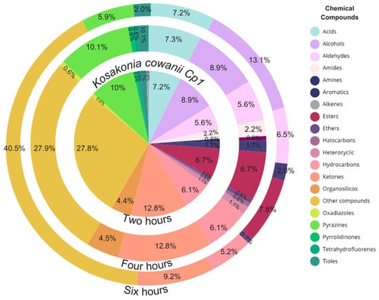 Characterization by means of HS-SPME-GC-MS of VOCs produced by K. cowanii Cp1 during bacterial growth phases. The colors in the graph represent the chemical classes of the VOCs identified as relative peak-area percentages.