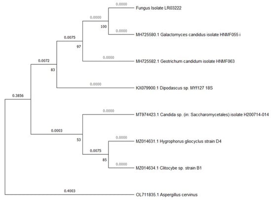 Phylogenetic tree for isolate LR03222. The phylogram shows the close relationship between our isolate and the sequences of Geotrichum candidum and Galactomyces candidus obtained from GenBank Nucleotide (available at https://www.ncbi.nlm.nih.gov/nuccore [accessed at 20 August 2023]). The tree shows the bootstrap values (numbers next to the vertex) and the distance between each sequence. The tree was constructed using the maximum-likelihood method, Kimura 2-parameter model and a bootstrap analysis with 500 replicates.