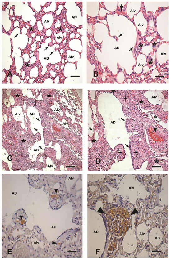 (A–F) Paraffin-embedded lung sections from uninfected dogs (controls) and dogs naturally and experimentally infected with L. infantum (BH401 strain). (A,B) Control dog: (A) Lower magnification showing pulmonary interstitial cells (alveolar wall) (asterisks), 220×. Note the regular pulmonary knob structures (black arrows). (B) Higher magnification showing interstitial cells into the interalveolar septum (asterisks), 440×. (C,D) Naturally infected dog: (C) Lower magnification showing a conspicuous thickness in the interalveolar septum (asterisks) associated with chronic interstitial pneumonitis in comparison to controls, 220×. (D) Presence of an intense chronic cell exudate into the intra-alveolar septum (asterisks); note the thickness of the pulmonary knob structures (black cross), the hypertrophy and hyperplasia of the pneumocytes (black arrows), and the hyperemia (large black arrow), 440×. (E,F) Experimentally infected dog (BH406 strain): Note immunolabeled amastigote forms of Leishmania (in brown) localized in the pulmonary interstitium (arrowheads), 440×. In (F), note the numerous macrophages loaded with immunolabeled parasites in the granuloma formation (large arrowheads), 440×. (A–D) Hematoxylin and eosin staining. (E,F) Immunohistochemistry streptavidin–peroxidase method with counterstaining with Harris hematoxylin. Alveolar duct (AD). Alveolus (Alv). Bars (A,C) = 20 µm; Bars (B,D–F) = 60 µm.