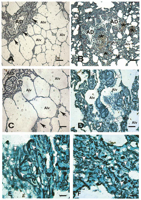 (A–F) Paraffin-embedded lung sections from an uninfected dog (control) and an experimentally infected dog with L. infantum (BH 401 strain). (A,C) Control dog: (A) Lower magnification showing a delicate distribution of reticular positive collagen fibers in black mainly observed in alveolar ducts (black arrows), 220×. (C) Higher magnification confirming a discrete presence of reticular collagen fibers in the intra-alveolar septa (black arrows), 440×. (B–F) Experimentally infected dog (BH401 strain). In (B), note a conspicuous chronic interstitial pneumonitis characterized by the thickening of the alveolar wall (alveolar septa) because of mononuclear cell exudate and collagen deposition (fibrosis) in comparison to the control (asterisks), 220×. (D) Higher magnification showing increased silver staining of collagen fibers in the alveolar septa (white arrowheads) and throughout the alveolar wall, mainly notable in knobs (structures of the lung parenchyma), where many of them project into the lumen of the alveolus or alveolar duct (white arrows), 440×. (E) Note a conspicuous black reticular fibers deposition in the alveolar septa as dense tangled structures described as “balls of black wool” (white arrows). Also, observe the epithelium hypertrophy and hyperplasia of the alveolar wall (white arrowheads), 440×. (F) Deep black reticular fibers’ deposition in the lung interstitium, sometimes thin (white arrows) and/or dense (arrowheads), can be observed. However, these black reticular fibers are arranged in various directions and often in a spiral or “stitch-like shape of the shortened and narrowed type” (arrowheads); 440×. Gomori’s ammoniacal silver staining. Alveolar Duct (AD). Alveolus (Alv). Bars (A,B) = 20 µm. Bars (C–F) = 60 µm.