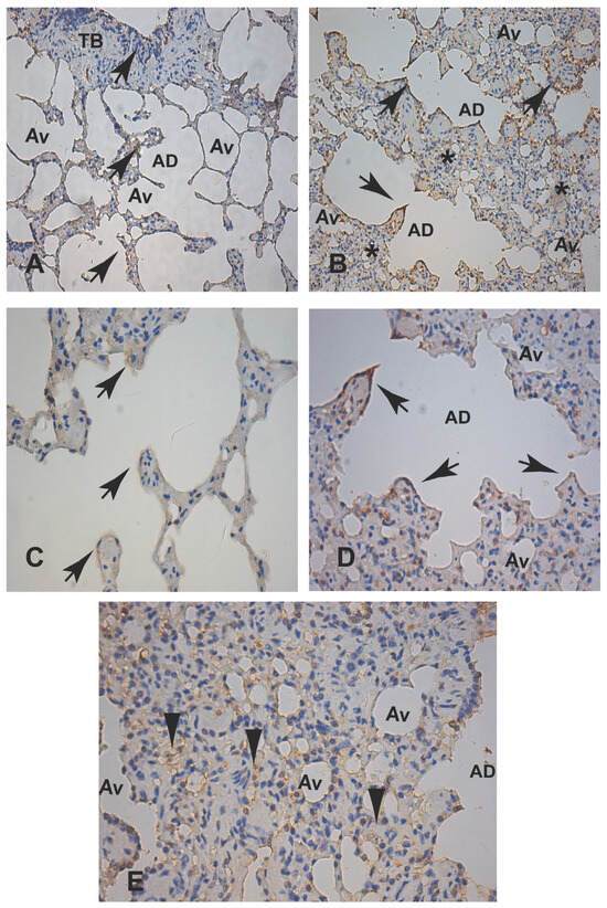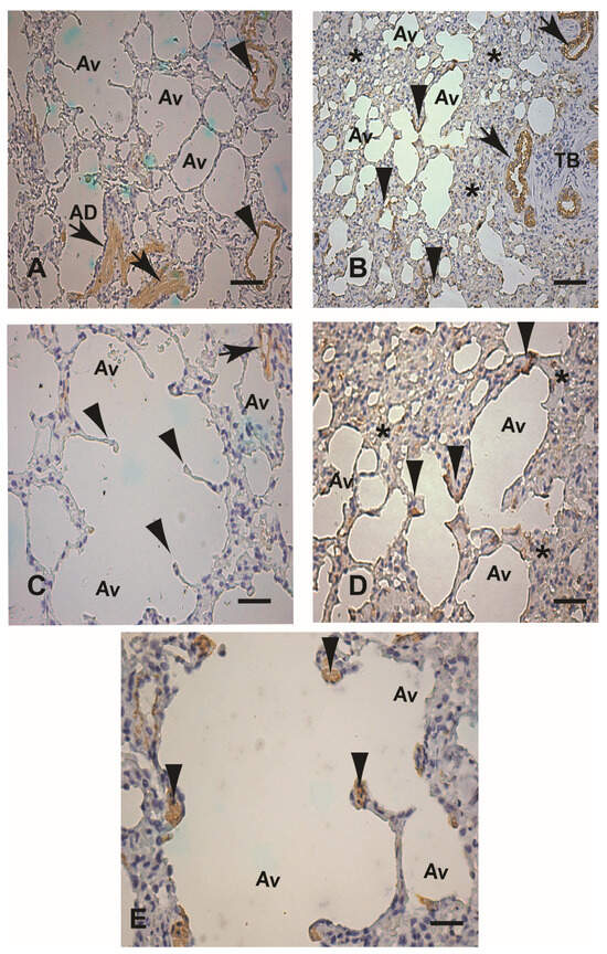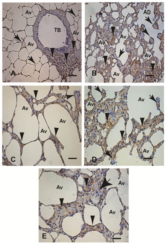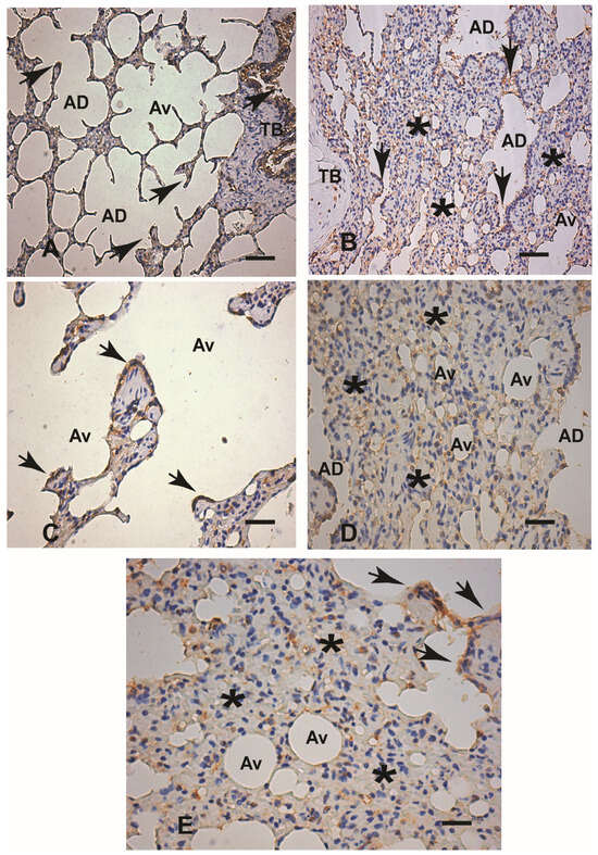 (A–E) Alfa actin (α-SMA) immunohistochemical expression in paraffin-embedded lung tissue samples from an uninfected dog (control) and an experimental dog infected with Leishmania infantum (BH401 strain). (A,C) Control dog: (A) Lower magnification showing restricted α-SMA-positive cell expression in cells compatible with smooth muscle fibers of alveolar duct walls (black arrows) and arteriole walls (black arrowheads), 220×. (C) Higher magnification shown in the upper right corner of the figure, α-SMA positivity only in the arteriolar wall (black arrow). Note the alveolar knobs and pulmonary structures without any positive staining (arrowheads), 440×. (B,E) Experimentally infected dog (BH401 strain): (B) Lower magnification to verify α-SMA positive cells in the alveolar hyperplastic epithelium wall and in the interstitium, just beneath the epithelium comprising the hyperplastic and hypertrophy knobs (black arrows). Note the intense chronic interstitial pneumonitis where the α-SMA positive cells are located (black asterisks), 220×. (D) Higher magnification showing the hyperplastic and hypertrophy knob structures of the alveolar ducts and alveoli (black arrowheads) and positive interstitial cells (black asterisks), 400×. (E) Note the positive α-SMA expression staining pattern just underneath the alveolar wall epithelium (knob pulmonary structures—black arrowheads), 440×. Immunohistochemistry streptavidin–peroxidase method with counterstaining with Harris hematoxylin. Alveolar duct (AD). Alveolus (Av). Terminal bronchiole (TB). Bars (A,B) = 20 µm. Bars (C–E) = 60 µm.