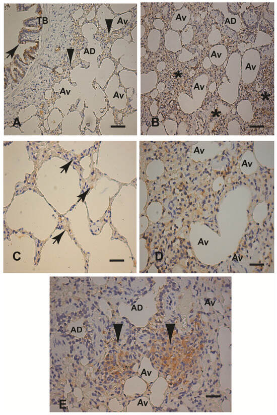 (A–E) Cytokeratin immunohistochemical expression in paraffin-embedded lung tissue samples from an uninfected dog (control dog), an experimental dog infected with the Leishmania infantum BH401 strain, and a dog naturally infected with Leishmania infantum. (A,C) Control dog: (A) Lower magnification showing discrete cytokeratin-positive cell expression in epithelial cells of the terminal bronchioles, alveolus ducts, and alveolus walls (black arrows), 220×. (C) Higher magnification showing discrete cytokeratin positivity labeling mainly in the epithelium of the arteriolar wall (black arrows), 440×. (B–E) Experimentally infected dog (BH401 strain): (B) Lower magnification to verify cytokeratin-positive cells markedly visible in the terminal bronchiole, alveolar ducts, and alveoli epithelium walls (black arrows). Additionally, observe the cytokeratin-positive cell following the intense chronic interstitial pneumonitis (black asterisks), 220×. (D,E) Higher magnification showing cytokeratin-positive cells in the pulmonary parenchyma (black asterisks). Note, in the right corner of figure (E), the presence of epithelial cytokeratin-positive cells (black arrows); 440×. Immunohistochemistry streptavidin–peroxidase method with counterstaining with Harris hematoxylin. Terminal bronchiole (TB). Alveolus duct (AD). Alveolus (Av). Bars (A,B) = 20 µm. Bars (C–E) = 60 µm.