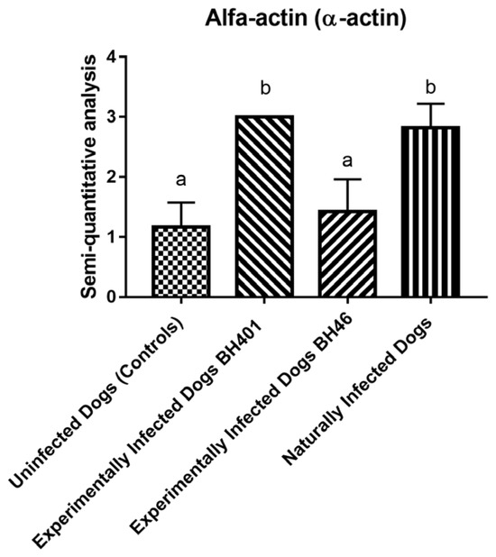 α-SMA cell expression morphometric analysis (semiquantitative study) among dog groups: dogs naturally infected with L. infantum, experimentally infected dogs with Leishmania infantum BH 401 strain, experimentally infected dogs with Leishmania infantum BH 46 strain, and uninfected dogs (controls). The “a” and “b” denote statistically significant difference (p < 0.0001).