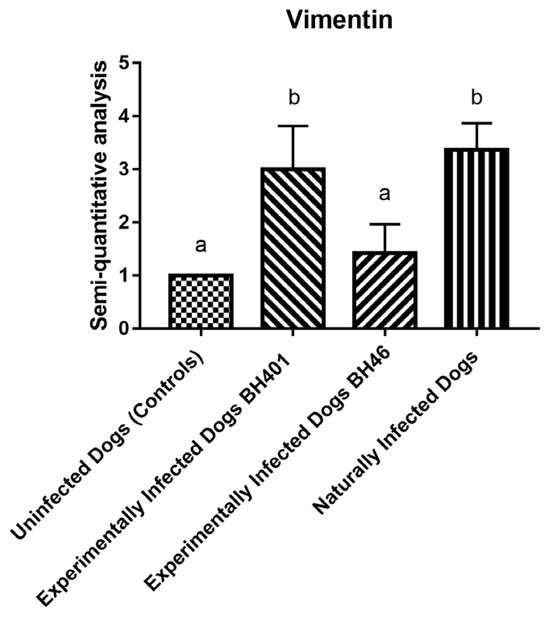 Vimentin cell expression morphometric analysis (semiquantitative study) among dog groups: dogs naturally infected with L. infantum, experimentally infected dogs with Leishmania (L.) infantum BH 401 strain, experimentally infected dogs with Leishmania infantum BH 46 strain, and uninfected dogs (controls). The “a” and “b” denote statistically significant difference (p < 0.0001).