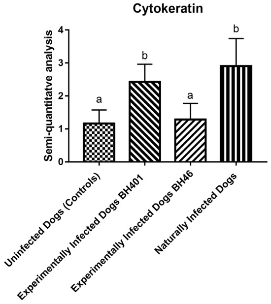 Cytokeratin cell expression morphometric analysis (semiquantitative study) among the dog groups: dogs naturally infected with Leishmania infantum, experimentally infected dogs with Leishmania infantum BH 401 strain, experimentally infected dogs with Leishmania infantum BH 46 strain, and uninfected dogs (controls). The “a” and “b” denote statistically significant difference (p < 0.0001).