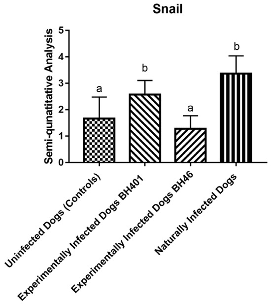 Snail antigen homologue 1 (Snail) cell expression morphometric analysis (semiquantitative study) among the dog groups: dogs naturally infected with Leishmania infantum, experimentally infected dogs with Leishmania infantum BH 401 strain, experimentally infected dogs with Leishmania infantum BH 46 strain, and uninfected dogs (controls). The “a” and “b” denote statistically significant difference (p < 0.0001).