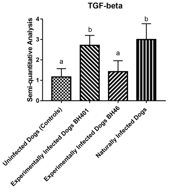Transforming growth factor-beta (TGF-β) cytokine expression morphometric analysis (semiquantitative study) among the dog groups: dogs naturally infected with Leishmania (L.) infantum, experimentally infected dogs with Leishmania infantum BH 401 strain, experimentally infected dogs with Leishmania (L.) infantum BH 46 strain, and uninfected dogs (controls). The “a” and “b” denote statistically significant difference (p < 0.0001).
