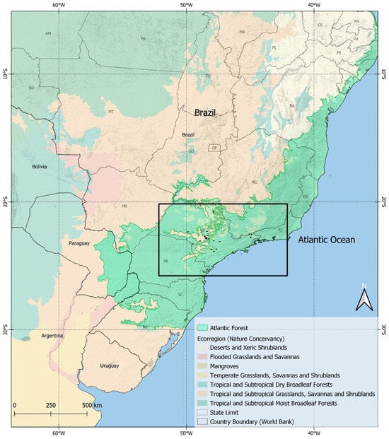 The Atlantic Forest is made up of several forests and ecosystems of its own, with more than 2000 native animal species, including birds, mammals, reptiles, amphibians and fish, covering 15% of Brazil’s territory. More than 70% of the Brazilian population lives in this area, so the biodiversity of the forests is very close to human beings. The forests of this region have suffered from deforestation and human invasion over the last few centuries, and currently, only 7% of the original forest remains [9]. The samples were obtained in the years 2020 to 2022, a pandemic period that resulted in around 37 million confirmed human cases of COVID-19 and 700,000 deaths in Brazil. In the state of São Paulo alone, where this study was carried out, there were more than 6 million confirmed cases and 181,000 deaths, which led to a prioritization of dealing with the disease in the country and a consequent deficiency in the control of other prevalent zoonotic diseases [10]. Figure 1 shows the study area [11,12,13].