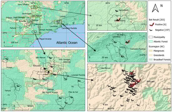 Distribution map of Trypanosoma cruzi infection detected in bats from Brazilian Atlantic Forest, São Paulo state (2020–2022).