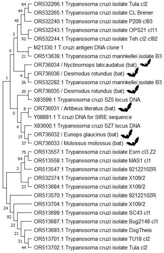 The sequences detected in this study were compared with other South American sequences targeting T. cruzi nuclear DNA, and showed interesting positions in the tree, showing the genetic diversity found in bats. It is worth highlighting the sequences obtained from E. glaucinus and M. molossus are from two bats collected on the same day by the team. Both showed proximity and genetic similarity according to the phylogenetic analysis.