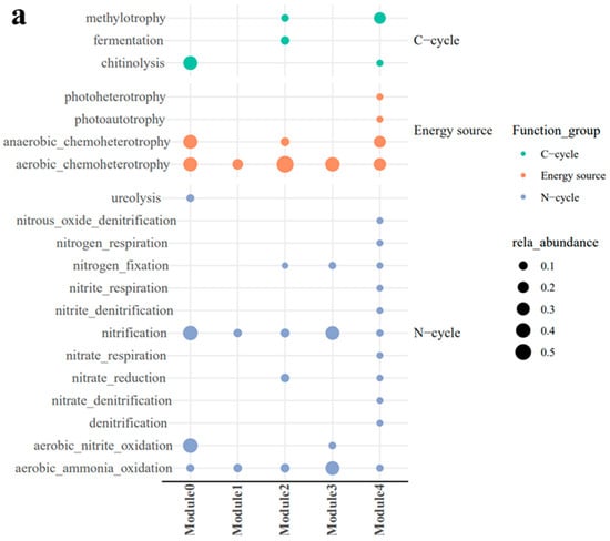 FAPROTAX (a) and FUNGuild (b) analysis of ecological modules, with black dots indicating the relative abundance of bacterial and fungal ASVs in each functional group (metabolic pathway).