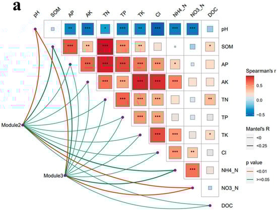 Mantel tests revealed that soil pH and NO3−-N are key environmental factors affecting the relative abundance of modules 2 and 3 (p < 0.05) (Figure 10a). Linear regression analysis of the relative abundance of these two modules with environmental factors was performed. Module 2 was negatively and significantly correlated with soil TN and SOM content, and module 3 was positively correlated with soil pH and negatively correlated with soil NO3−-N content (p < 0.05) (Figure 10b).