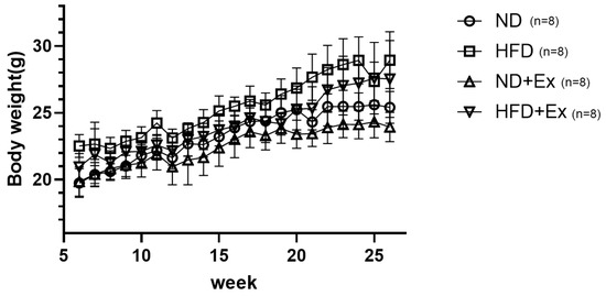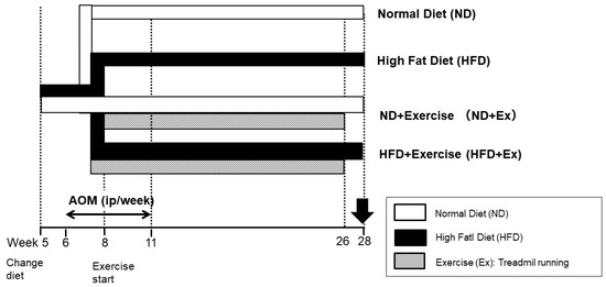 Mice were divided into four groups according to diet and exercise (Figure 1). The diet was changed after acclimation for 1 week. The diets were a normal diet (ND) and a high-fat diet (HFD 60Ⓡ, total calories 5062 kcal/kg; calorie ratio (%): protein 18.2, fat 62.2, and digestible carbohydrates 19.6). The exercise (Ex) consisted of treadmill exercise [16,17]. Running speed was 18 m/min, 30 min/day, and 5 days/week. Exercise was started at 6 weeks of age for 2 weeks and continued for 20 weeks from 8 to 26 weeks.