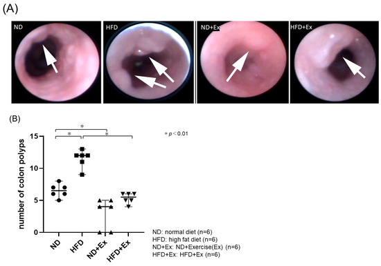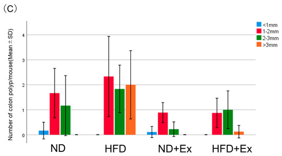 HFD increased the number of colorectal polyps more than ND (ND 6.5 ± 1.3, HFD 11.4 ± 1.5, p < 0.001). Exercise suppressed the number of colonic polyps in both the ND and HFD groups (ND 6.5 ± 1.3, ND + Ex 2.8 ± 2.5, p < 0.05) (HFD 11.4 ± 1.5, HFD + Ex 5.2 ± 0.8, p < 0.01). The polyp suppression effect of exercise was greater with the HFD (Figure 3A,B).