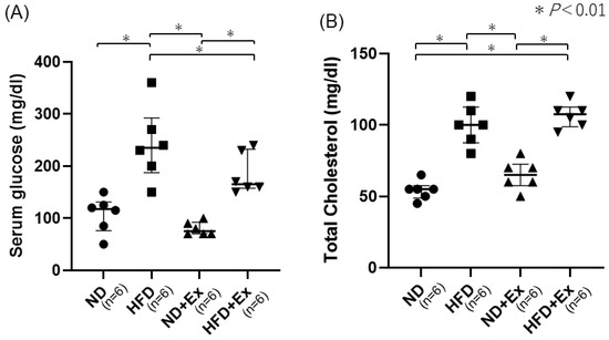 (A) Blood glucose and (B) total cholesterol levels. Serum blood glucose levels were higher in the HFD group than in the ND and decreased with the addition of Ex. The decrease associated with Ex was particularly marked for the HFD.