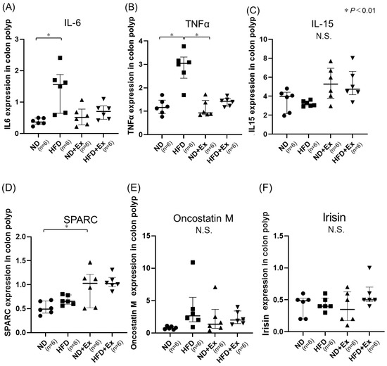 Expression of cytokines and myokines by qPCR in colonic tumors. (A) IL-6; (B) TNF-alpha; (C) IL-15; (D) SPARC; (E) Oncostatin M; and (F) Irisin. The HFD group had significantly lower TNFα and IL-6 in colon tissue than the ND group. Exercise did not affect cytokines, and SPARC was significantly higher only in the ND group. ● ND group, ■ HFD group, ▲ ND + Ex group, ▼ HFD + HFD + Ex group.