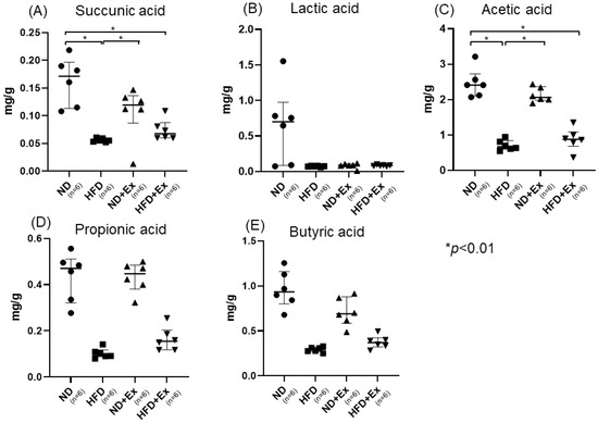 Fecal SFA levels: (A) succinic acid; (B) lactic acid; (C) acetic acid; (D) propoonic acid; and (E) Butyric acid. Succinic acid and acetic acid were significantly lower in the HFD than in the ND. Succinic acid and acetic acid were significantly increased in the ND+Ex, as compared to HFD.